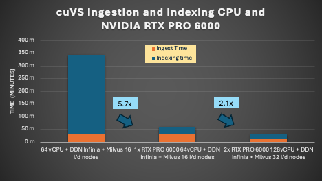 As companies scale up their AI factory workloads, Retrieval-Augmented Generation (RAG) pipelines are scaling to tens and hundreds of millions of embeddings. There is a direct relationship between increasing enterprise knowledge available to AI agents and the size of vector embeddings. As scale increases, vector ingestion and indexing become the bottlenecks where users feel the pain of out-of-date knowledge bases and taking days to weeks to ingest data into their vector database. Enterprises endeavor to provide the best end user experience with fresh, accurate, and comprehensive responses, but CPU-only indexing pipelines and local-storage–centric architectures make it impractical to update data fast enough to keep knowledge bases current. Moreover, GPU-accelerated indexing enables faster database re-indexing because of pipeline updates or data drift, reducing maintenance downtime.