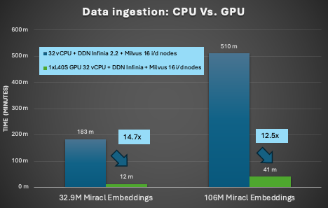 To show the differences between CPU and GPU performance, we ran several tests reflecting the turnaround time for adding new documents to an enterprise knowledge base ready for use by AI agents. We baselined the performance using the Miracl dataset running against a Milvus 2.5 Vector Database with embeddings generated via NVIDIA llama-3.2-nv-embedqa-1b-v2 running against 32 vCPUs. All storage used was DDN Infinia 2.2, using the S3 API as the communication method, including for the backing store for Milvus. We ingested up to 106M embeddings (~2TB of multimodal data) into the vector database with data hosted on Infinia.