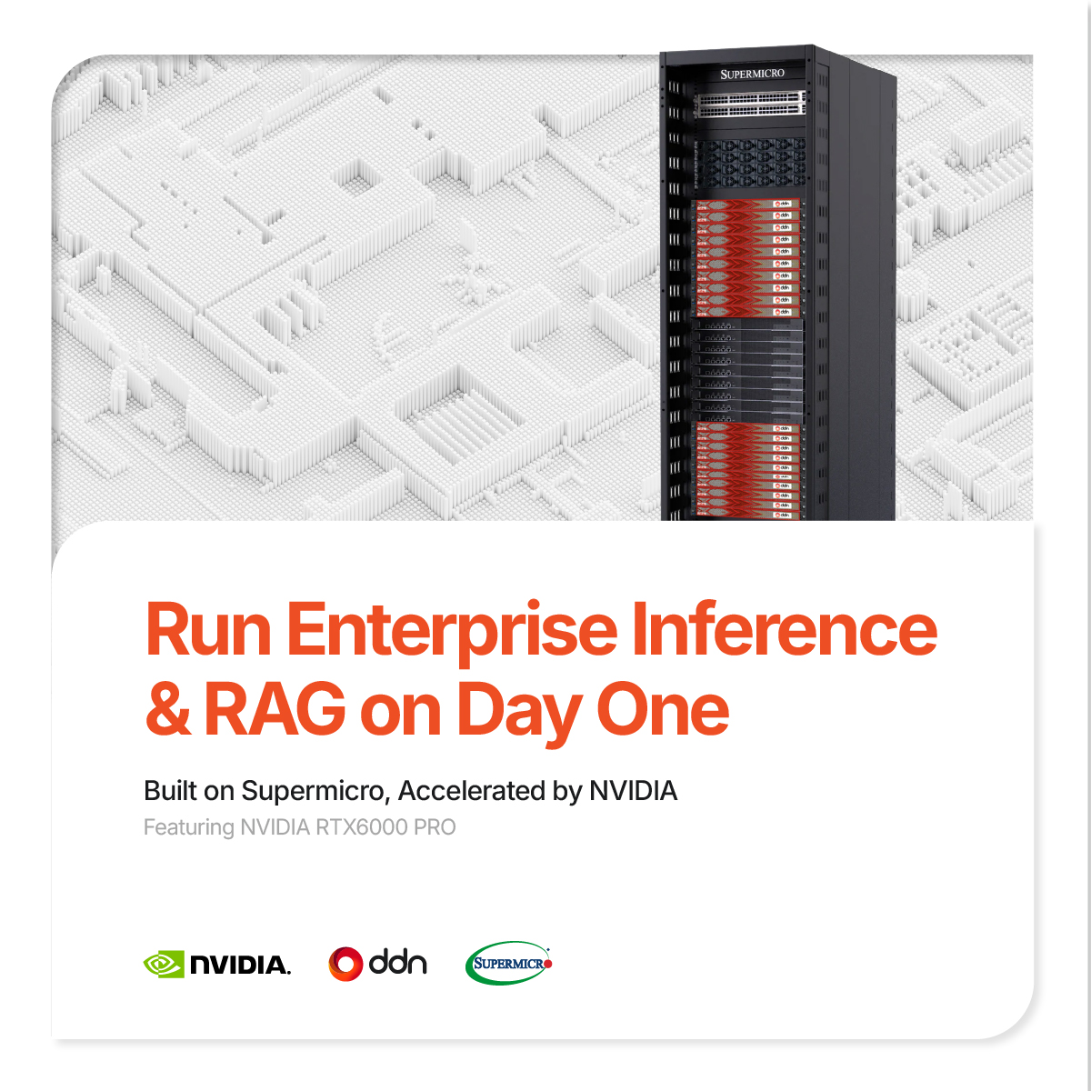 A pre-configured Enterprise Inference Solution built with NVIDIA AI Data Platform (AIDP) that can deploy inference & RAG in hours. Ready on day one – powered by DDN Infinia, built on Supermicro, accelerated by NVIDIA.