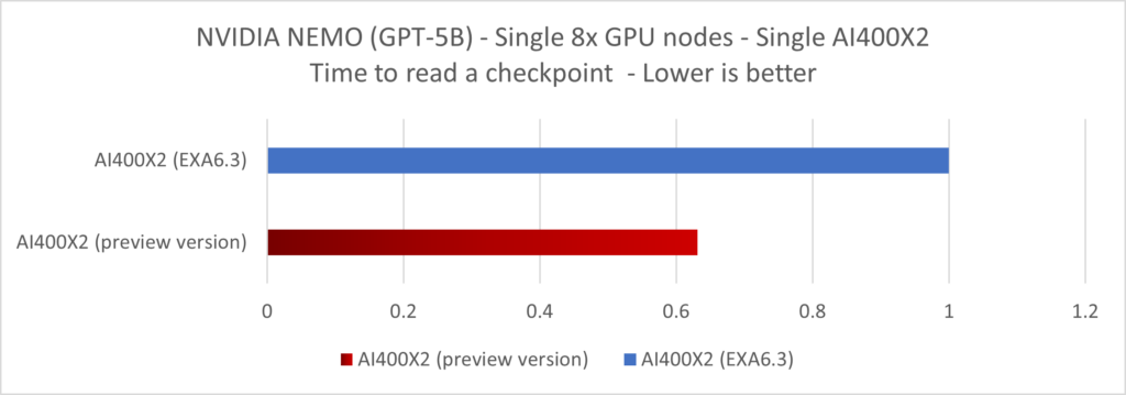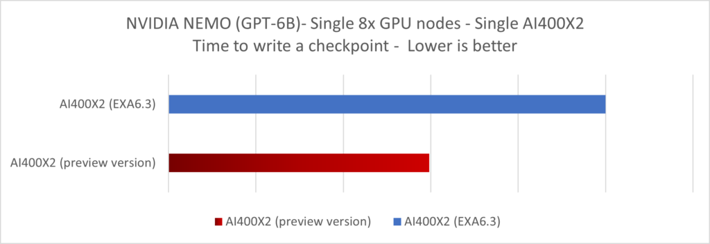 To verify our claims, we installed a pre-released version of our EXAScaler software containing the hybrid-IO optimization on a DDN AI400X2 appliance. After having connected that appliance to a GPU node, we tested a couple of SOTA AI libraries, such as NVIDIA NeMo and HuggingFace, and we measured the checkpointing performance before and after enabling Hybrid-IO.